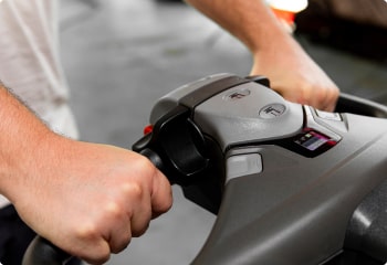 El timón ergonómico con botones de control intuitivos se puede utilizar con cualquier mano y ofrece un control y una productividad excelentes. La función Click-2-Creep permite el desplazamiento a marcha lenta y la conducción con el timón en posición vertical.